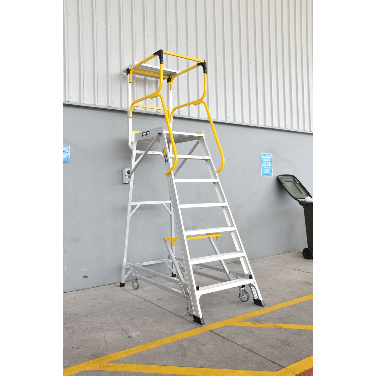 The Bailey FS13595 LADDERWELD® 7 Step Access Platform is a durable, fully welded aluminium platform designed to deliver safe and efficient access to elevated work areas. Engineered for demanding industrial environments such as warehousing, transport, aviation, mining, and maintenance facilities, it offers a stable working surface accessible from three sides. The 100 mm deep treads provide secure footing and comfort, while the large 125 mm wheels ensure smooth movement. A manual braking system with a high-visibility activation arm locks the unit securely in place. Supplied flat packed for easy transport and quick assembly, the platform also includes a detachable shelf for stock picking or tool placement.