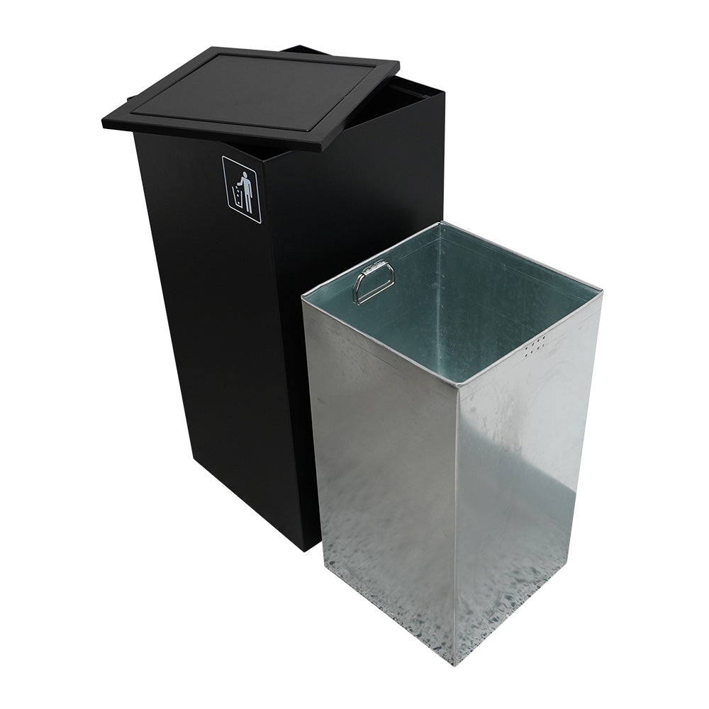 The Indoor Waste Bin with a black swing-top lid is designed for discreet waste disposal in settings where appearance and cleanliness matter. The swing lid conceals contents while allowing hands-free operation, making it ideal for offices, hotels, washrooms, and venue bathrooms. Constructed from 0.8mm galvanised steel with a smooth matte black finish, it provides both durability and a refined aesthetic.