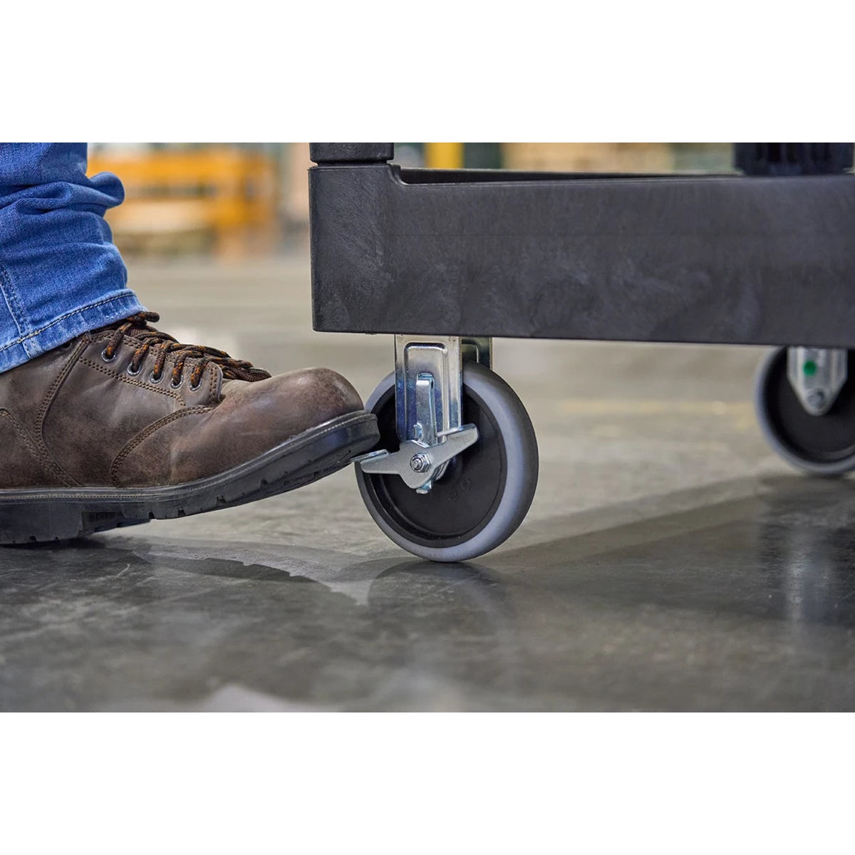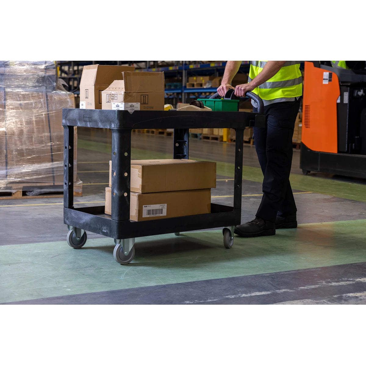 The Rubbermaid Heavy-Duty Utility Cart is engineered for transporting large, heavy loads with ease in industrial, commercial, and hospitality settings. Constructed from structural foam resin, the cart resists dents, chips, and rust, ensuring years of reliable service. Its three flat shelves provide a spacious, open design for carrying bulky items, boxes, or equipment, while ergonomic handles and smooth castprs make it easy to manoeuvre even when fully loaded.