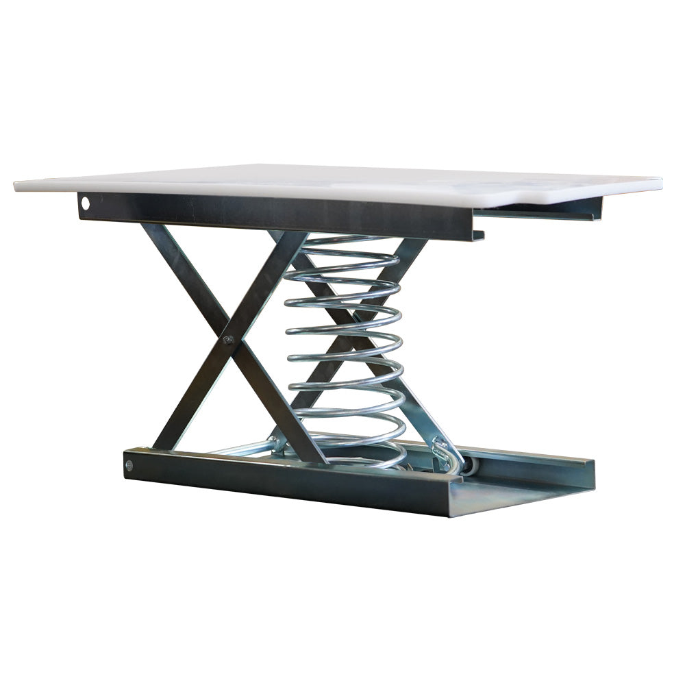The insert uses a mild steel base with a virgin HDPE deck and a 905 × 495 × 10mm top plate to support tubs securely. With a 50kg spring tension, the platform moves through a working height range from 443mm raised down to 173mm compressed, depending on load. The 530 × 300mm base footprint helps keep the assembly stable inside the tub, making it suited to repetitive pick/pack, stores, hospitality back-of-house, and general materials handling where reduced strain and smoother workflow matter.