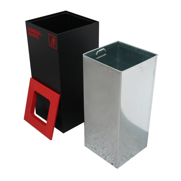This indoor Waste Recycling Station Kit provides a simple and effective solution for separating general waste and recycling in schools, medical clinics, hospitals, and other commercial indoor environments. The kit consists of two individual bins constructed from galvanised steel with a matte black finish, offering durability and corrosion resistance for daily use. Colour-coded lid inserts clearly distinguish each waste stream, supporting correct disposal in shared and regulated settings.